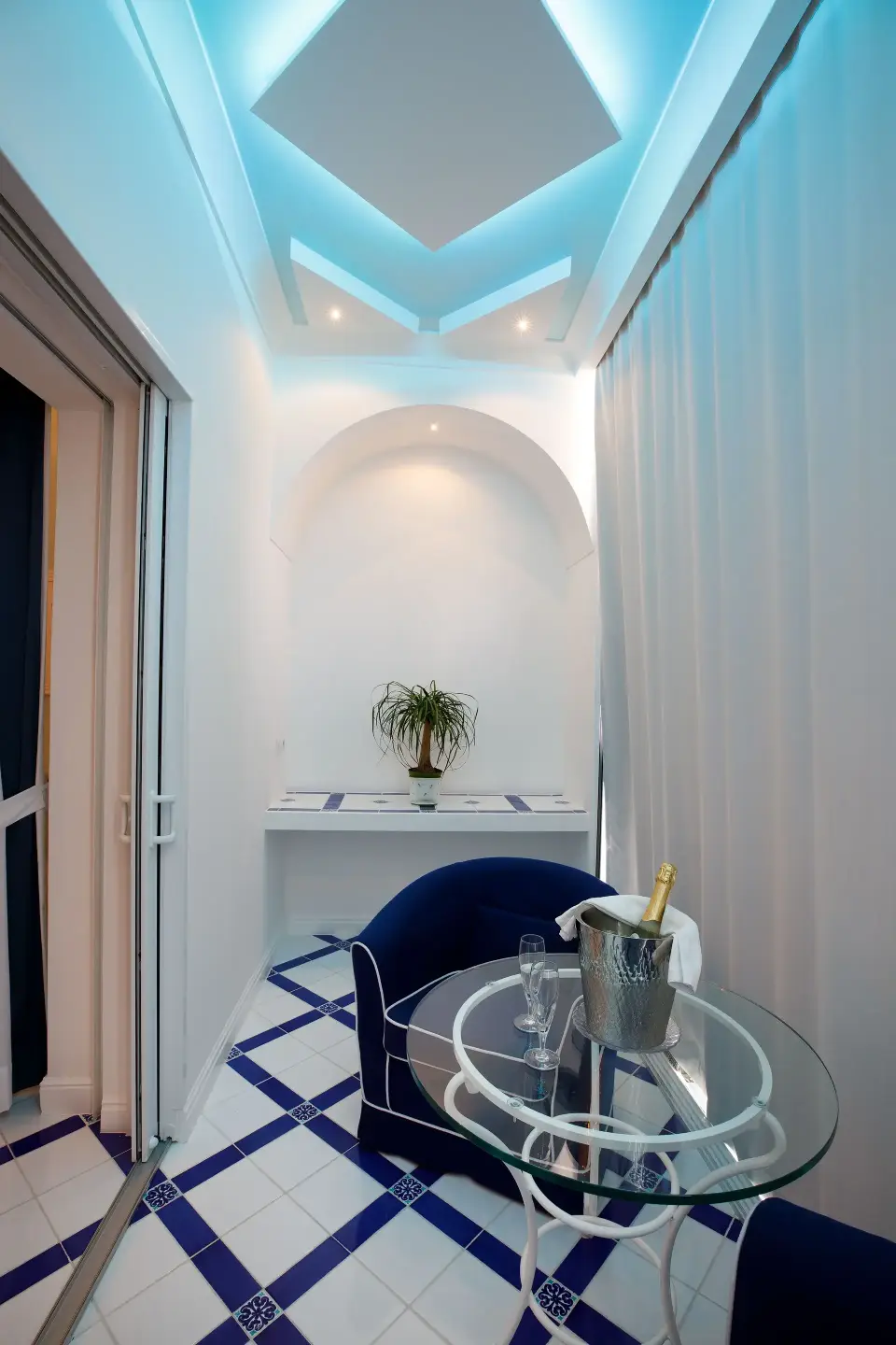 A bright / cosy veranda with wide glass windows creates a space suspended between inside and out - a magical atmosphere to unwind mind and body. As evening falls, this beauty is enhanced by a captivating play of chromotherapy lights. Your private panoramic terrace is where unforgettable moments are made. Each morning begins with a table-served breakfast against a stunning panorama, while comfortable sun loungers invite you to relax in the sun and admire the view..
